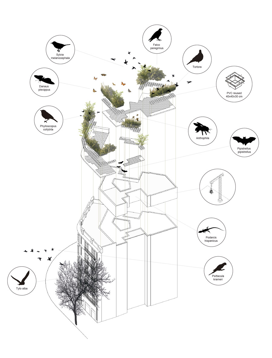 La vegetación se organiza en dos estratos. Uno más alto que conecta con los Platanus hispanica característicos de l’Eixample y un segundo estrato, más bajo, con un crecimiento rastrero como la Carissa macrocarpa de gran atractivo para las aves. También incluimos gramíneas tipo Stipa tenuissima, para dar movimiento en la plantación.