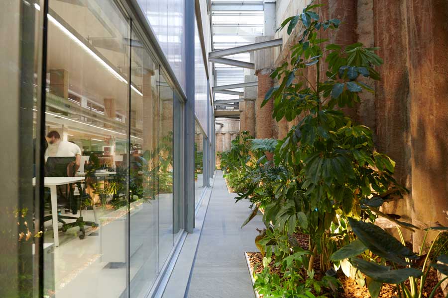Creamos un espacio verde, estético, contemplativo y participativo, por el que poder deambular, a modo de “Jardín Peripatético”, donde lo importante era el punto de vista desde el propio edificio hacia el exterior. Dimos protagonismo al elemento agua y a una vegetación densa con especies poco usuales, frondosas y exuberantes, de hoja grande, típicas de sistemas húmedos y oscuros.