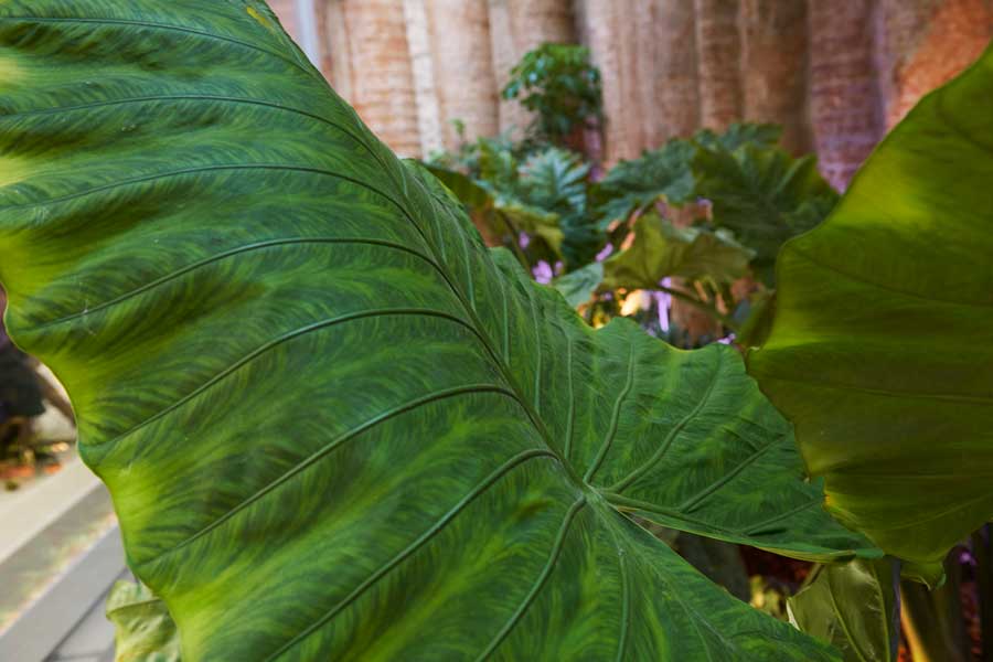 Las especies elegidas se adaptan a las condiciones de humedad, luz indirecta y gran altura. Plantamos ejemplares tan grandes como la Strelitzia sp, la Monstera sp o la Alocasia sp y la Gunnera sp, que contrastan con helechos y especies particulares como el Acanthus mollis y el Equisetum hyemale.