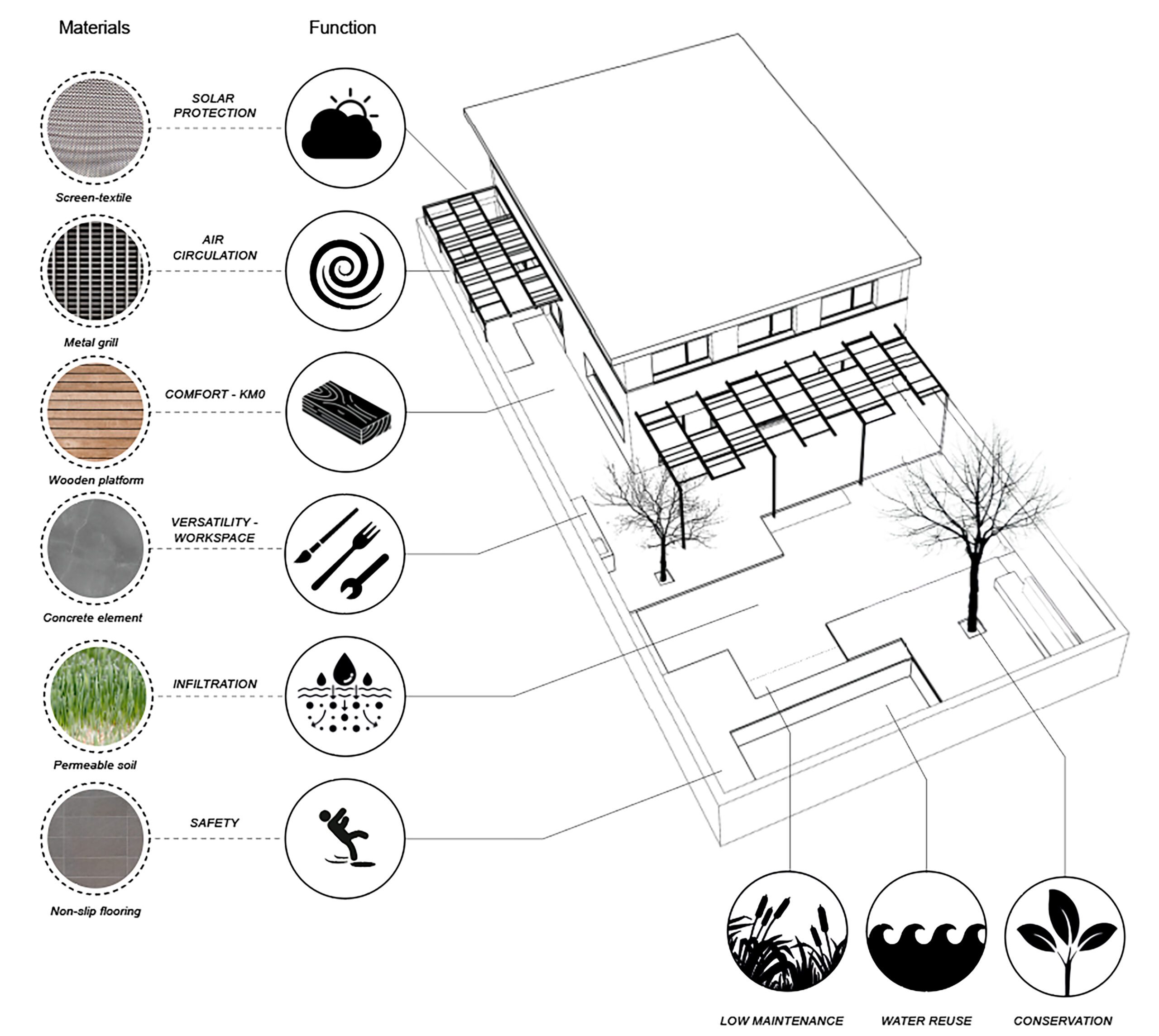 Se hizo evidente en nuestro proyecto que concebimos vivienda + jardín como el mismo organismo. Conseguimos dar al jardín un carácter más orgánico, añadimos valor al conjunto, dotando el espacio del programa necesario. El dinamismo en el proyecto no solo se intuye en las circulaciones, sino en la forma de alternar materiales y soluciones distintas para generar volumetrías ricas, pasando de un espacio encorsetado a un espacio orgánico. Apostamos por la unidad de cota y de materiales como extensión del interior. El mobiliario fijo, diseñado y construido in-situ, marca la estructura del jardín, y bien sea de madera, hormigón, inox o hierro, continúan el discurso del espacio interior, ofreciendo confort y resistencia.