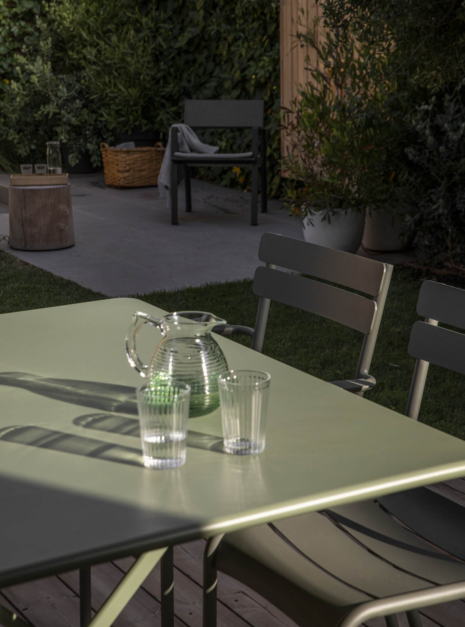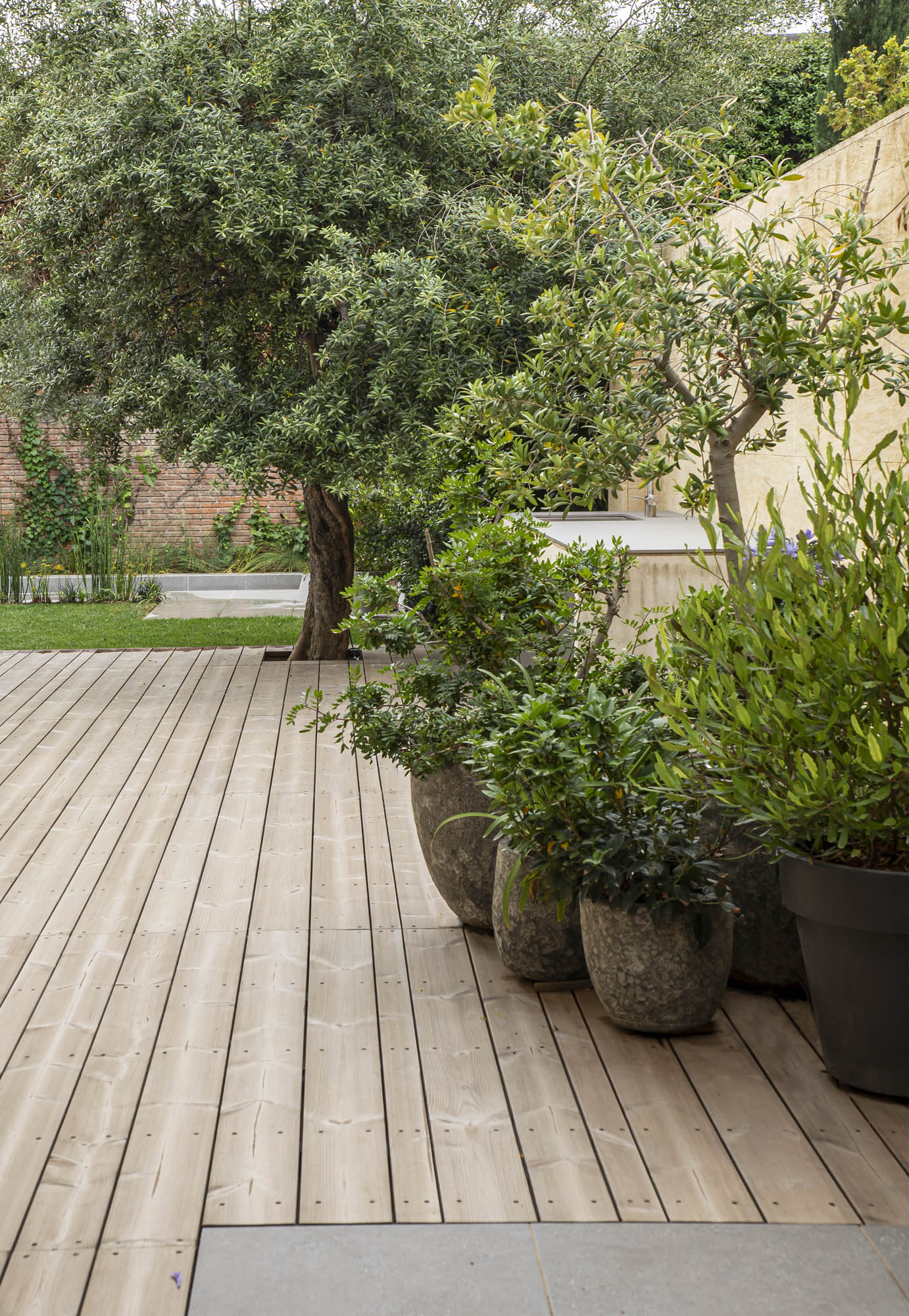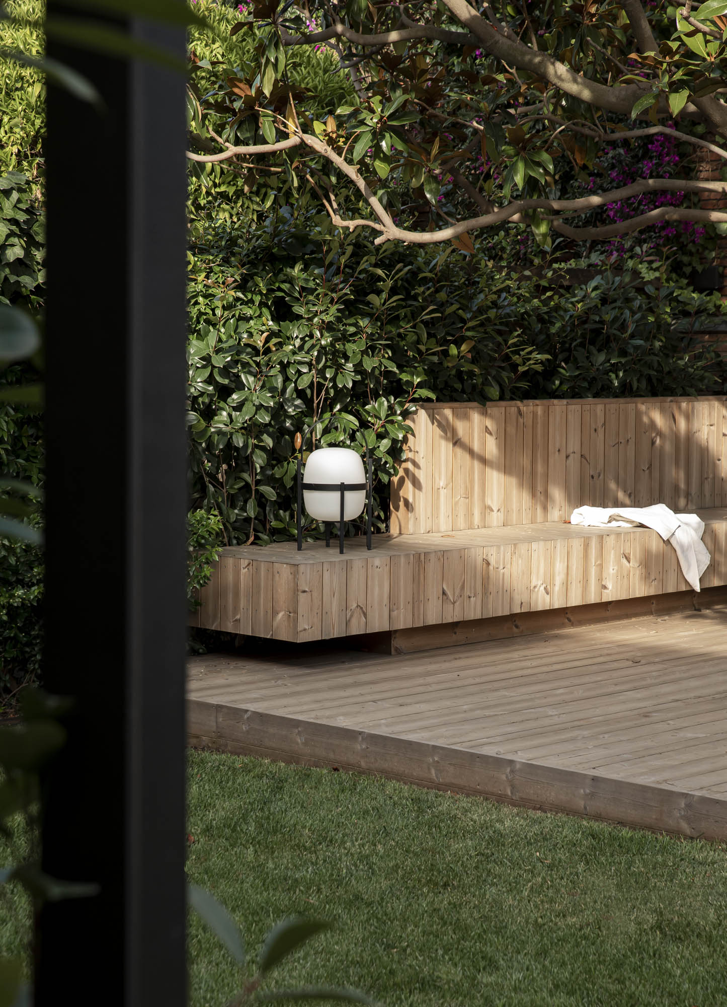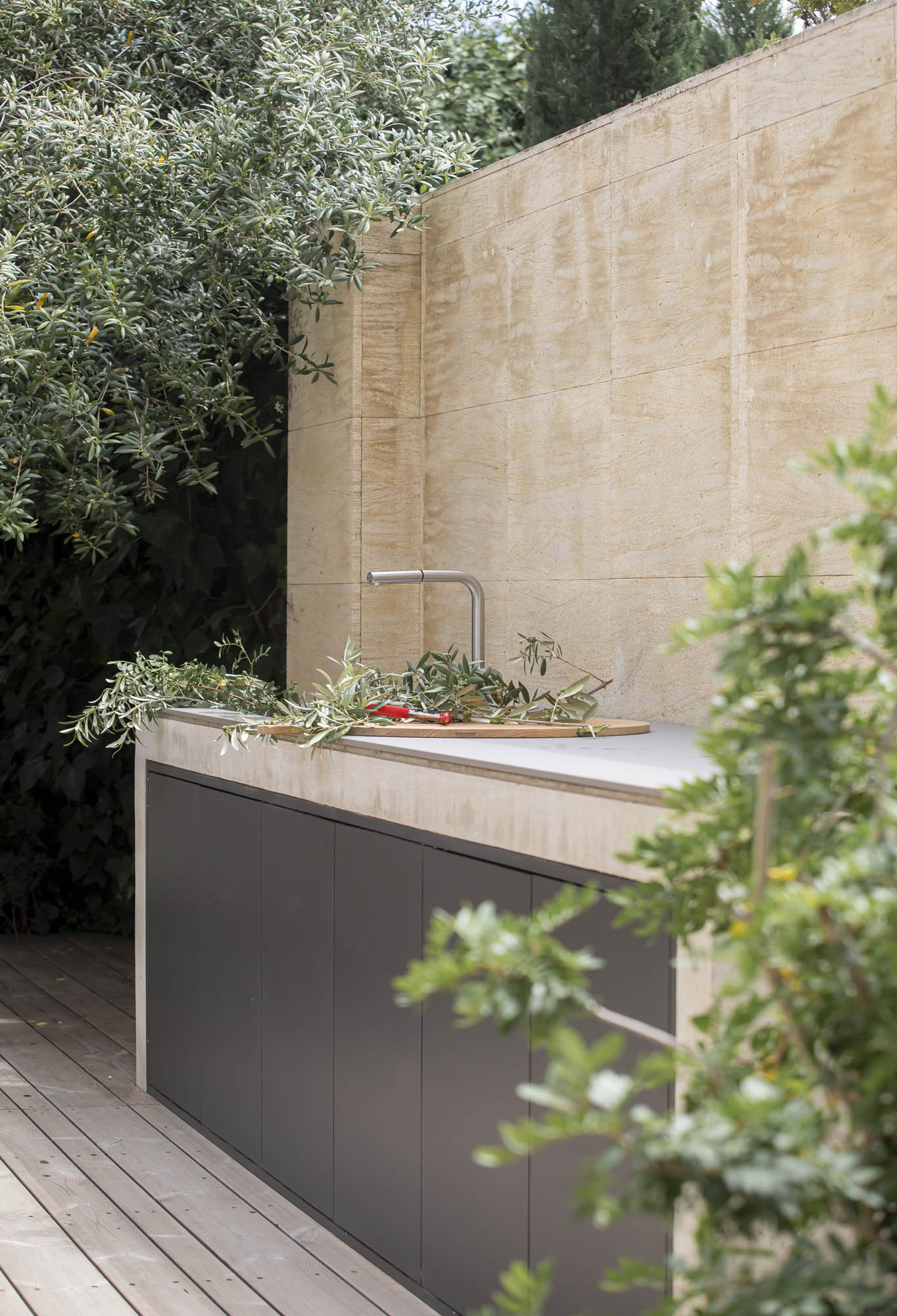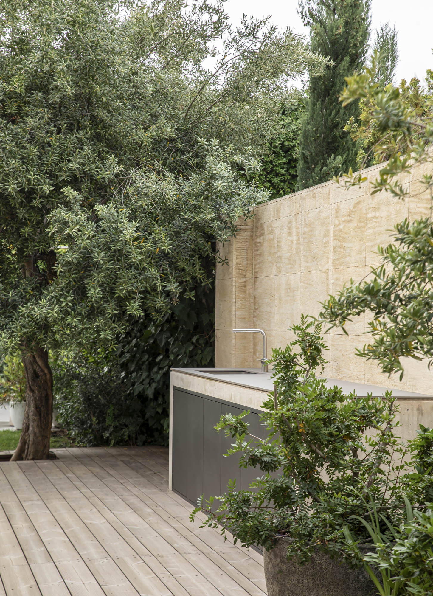 Se hizo evidente en nuestro proyecto que concebimos vivienda + jardín como el mismo organismo. Conseguimos dar al jardín un carácter más orgánico, añadimos valor al conjunto, dotando el espacio del programa necesario. El dinamismo en el proyecto no solo se intuye en las circulaciones, sino en la forma de alternar materiales y soluciones distintas para generar volumetrías ricas, pasando de un espacio encorsetado a un espacio orgánico. Apostamos por la unidad de cota y de materiales como extensión del interior. El mobiliario fijo, diseñado y construido in-situ, marca la estructura del jardín, y bien sea de madera, hormigón, inox o hierro, continúan el discurso del espacio interior, ofreciendo confort y resistencia.