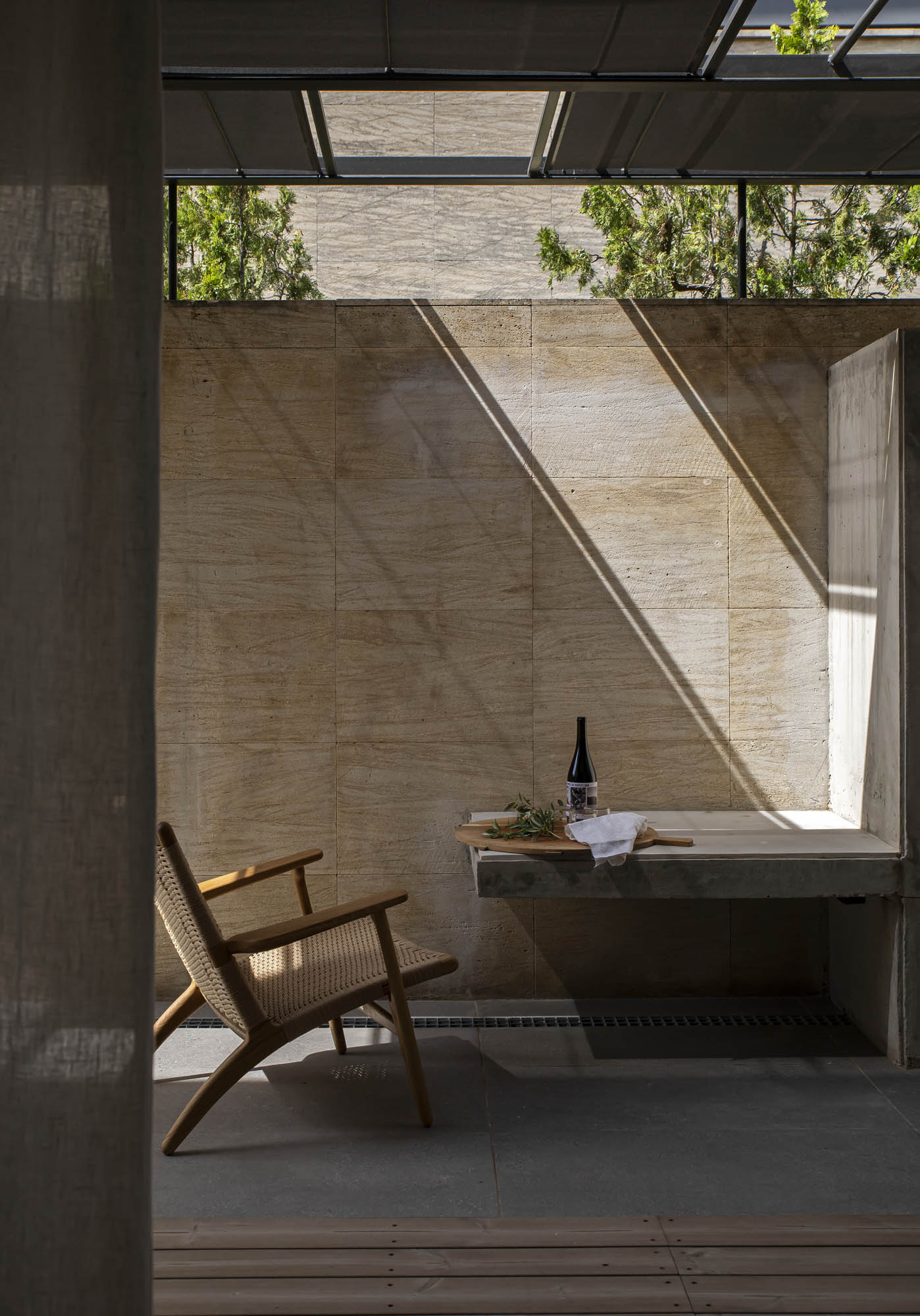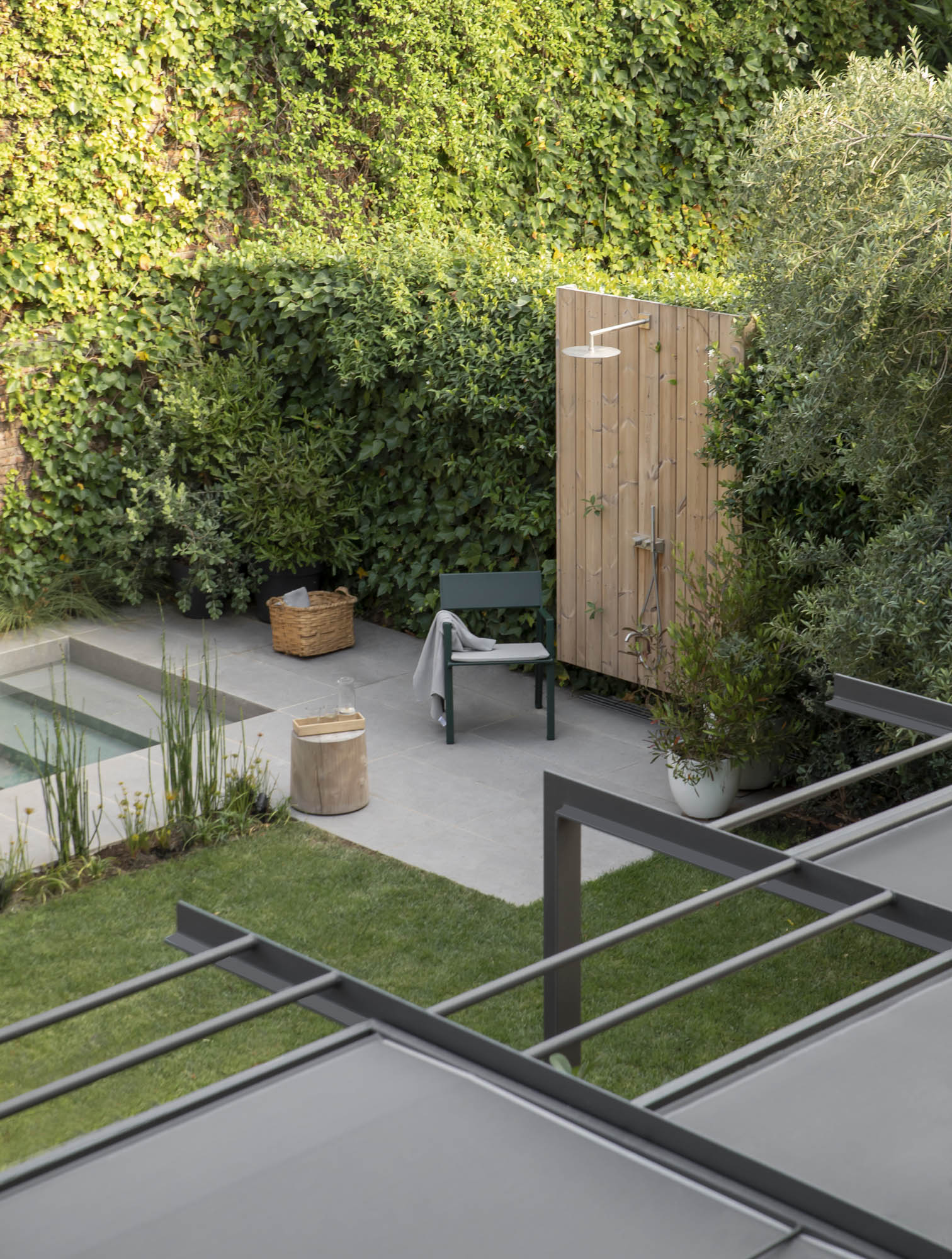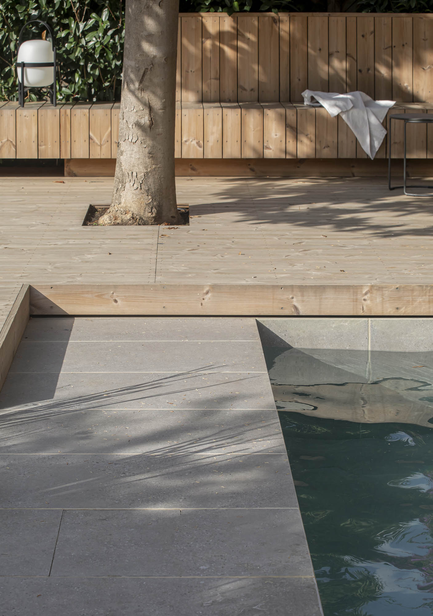 Redefinimos el programa y las zonas húmedas del jardín según criterios estéticos, funcionales y de eficacia de gestión del agua, con una piscina más proporcionada y un comedor exterior protegido de la lluvia y el sol. Para esto, incorporamos una pérgola con paneles móviles que aporta dinamismo y sombras para favorecer la recirculación del aire y el control térmico del interior de la vivienda de una forma natural. Al mismo tiempo, nos permite proporcionar un espacio más cómodo para los usuarios, adaptándonos a la incidencia solar según la época del año. Aportamos también un módulo de cocina de intemperie que funciona a la vez como taller artístico, y compactamos las instalaciones para tener un nuevo acceso al jardín desde la calle, muy práctico para la vida con niños.