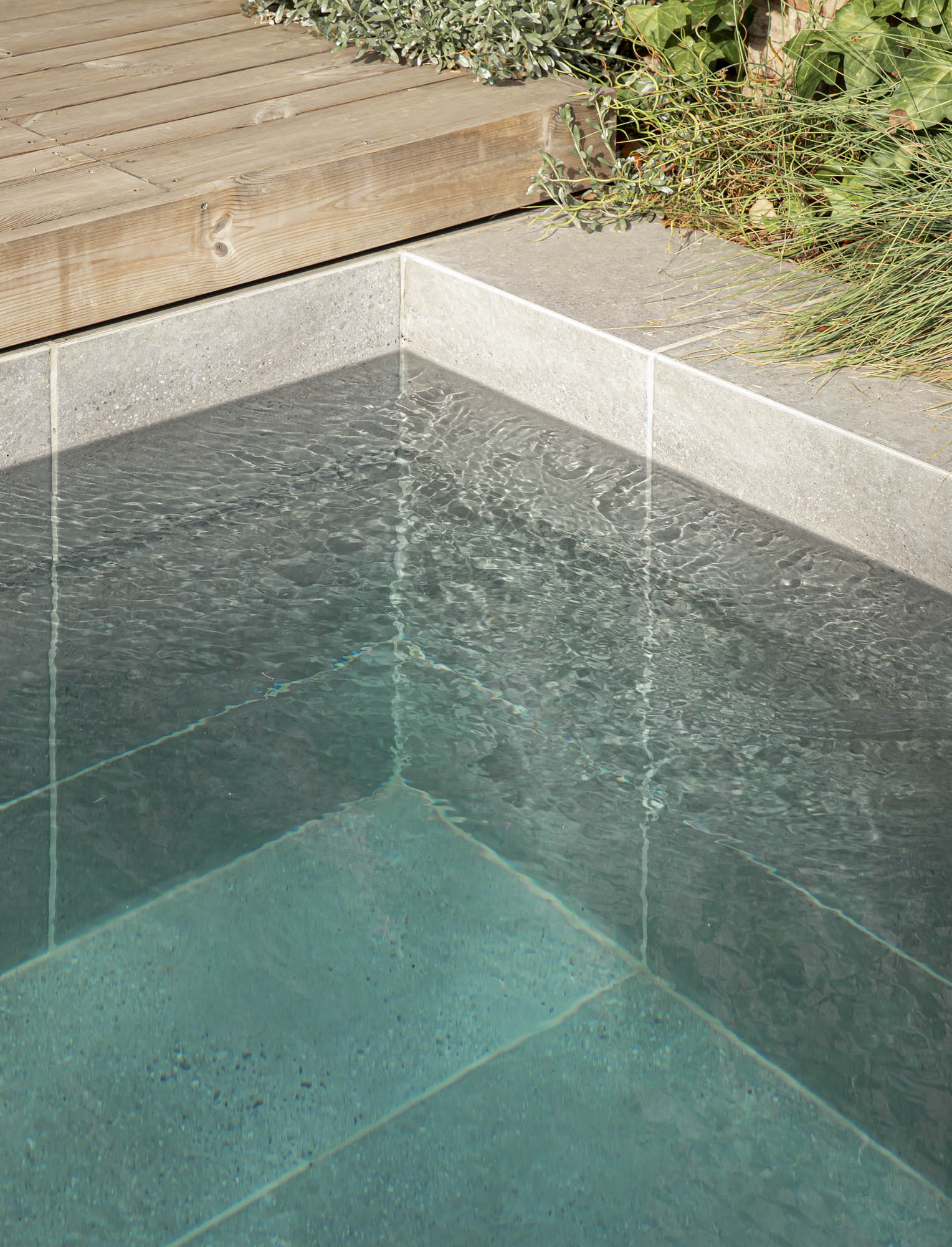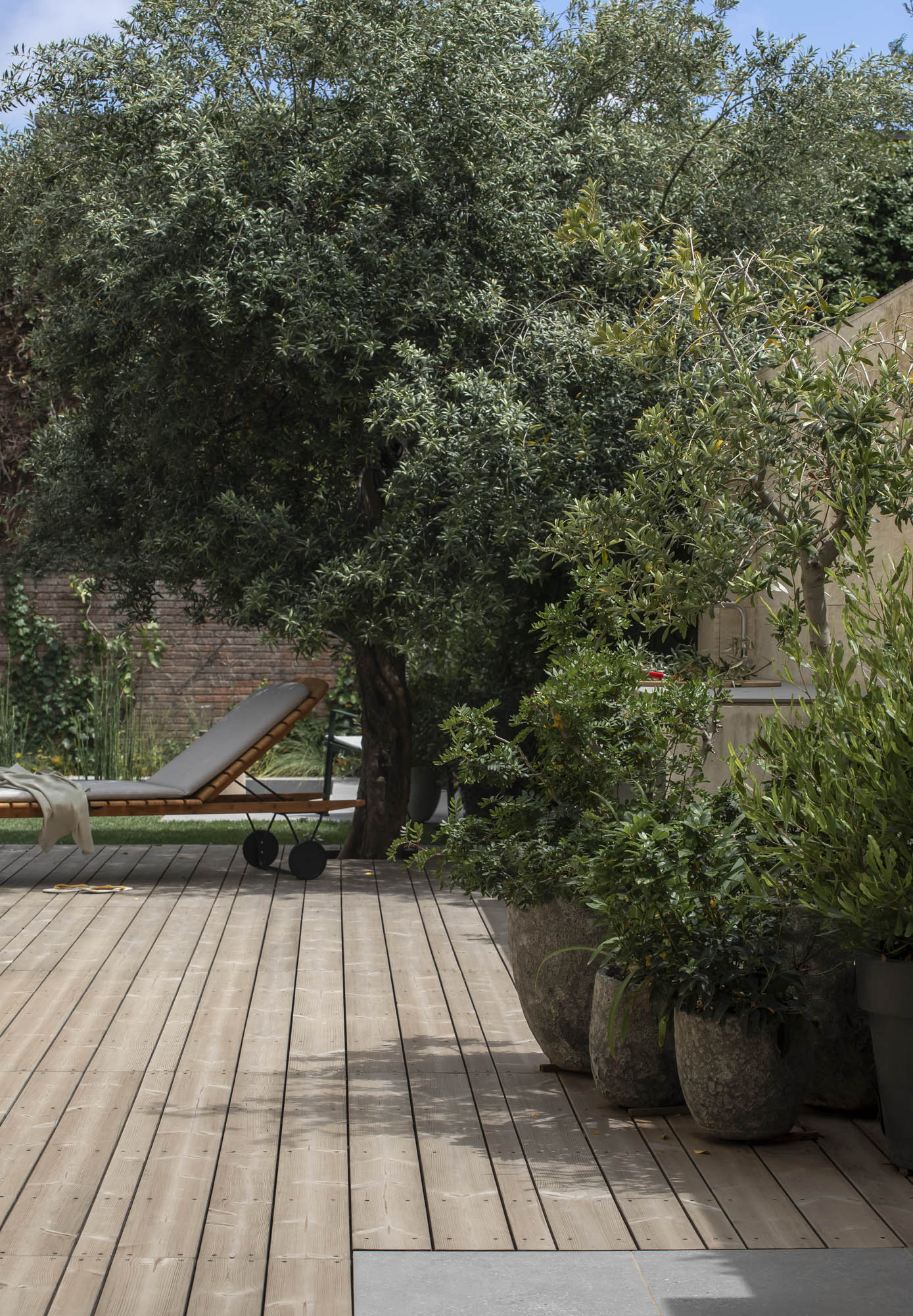 La paleta vegetal se organizó en grupos, según el tipo de crecimiento y funcionalidad, integrando los elementos existentes a conservar. Como particularidad, buscamos la variedad y riqueza de colores y texturas para crear un entorno frondoso y acogedor. Utilizamos una cuidadosa selección de especies de estanque, como Equisetum hyemale, Cyperus haspan y Juncus effusus, que reduce la necesidad de mantenimiento intensivo y aprovecha los sobrantes de agua de la zona húmeda del jardín.