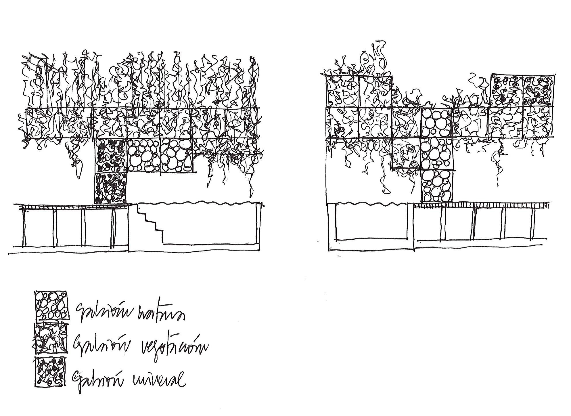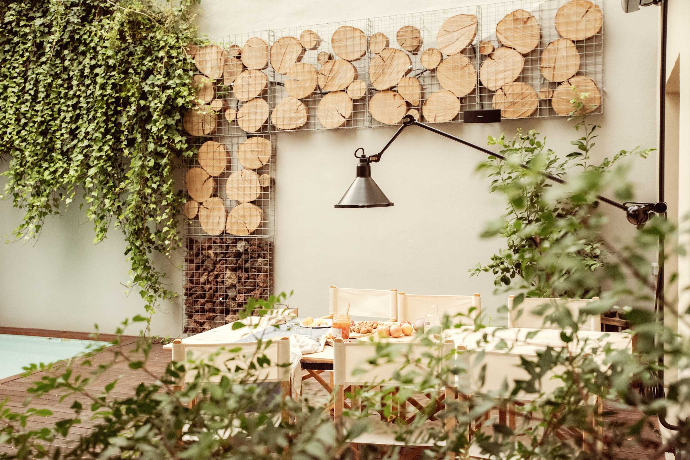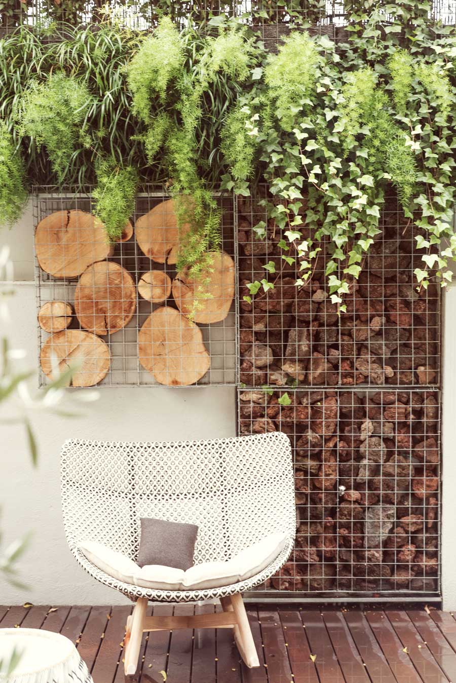 Las características de construcción de la piscina, a nivel con el pavimento, nos dio la oportunidad de plantar a cota cero. Se incluyó un olivo de medio siglo, el sueño del cliente. Para las paredes propusimos una composición de gaviones con naturaleza muerta: troncos de Platanus hispanica del entorno de Barcelona, piedra mineral volcánica, y un tercero con vegetación viva.