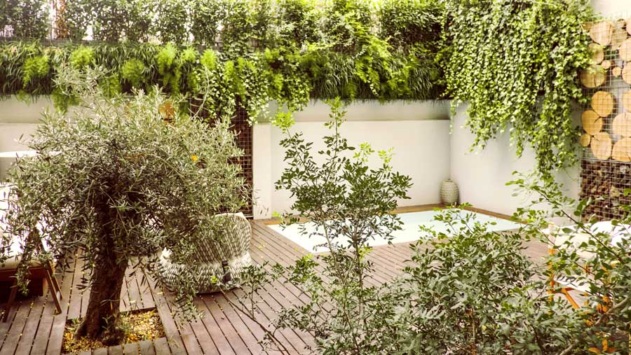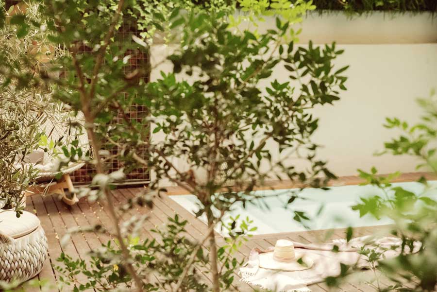 Nos centramos en los elementos positivos que disponíamos. Pusimos en valor las paredes altas, colonizándolas con revestimientos naturales y vegetación colgante. El jardín se llenó con gran profusión de arbustos y plantas situados estratégicamente para crear rincones de privacidad.