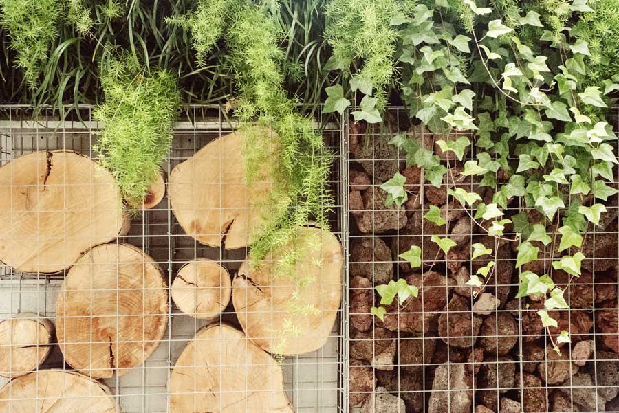 Las características de construcción de la piscina, a nivel con el pavimento, nos dio la oportunidad de plantar a cota cero. Se incluyó un olivo de medio siglo, el sueño del cliente. Para las paredes propusimos una composición de gaviones con naturaleza muerta: troncos de Platanus hispanica del entorno de Barcelona, piedra mineral volcánica, y un tercero con vegetación viva.