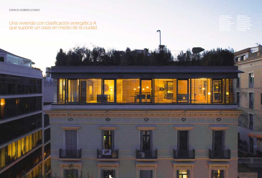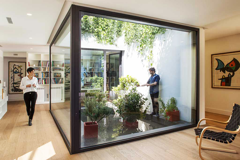 El resultado fue una construcción a dos niveles. Al entrar en la vivienda te recibe un pequeño patio acristalado con un estanque y una escultura. Todo ello forma una composición de cielo, agua y vegetación que insinúa el jardín que te espera en la cubierta.